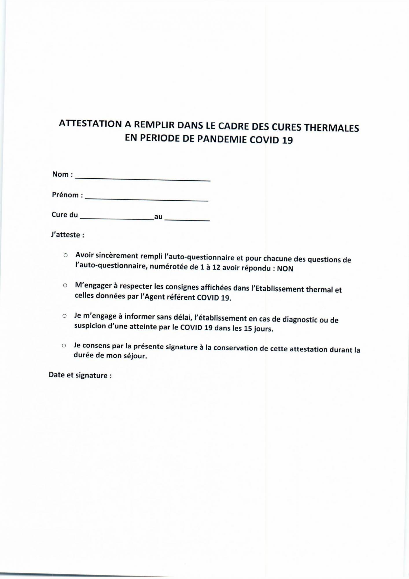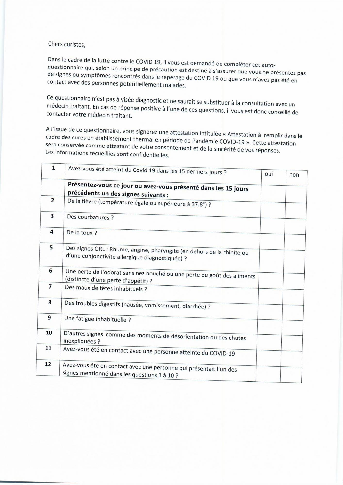 15 jours avant son arrivée, chaque curiste est interrogé sur son état de santé. Un examen est également réalisé par le Médecin Thermal, avant le démarrage de la cure. En cas de suspicion d'une infection au coronavirus, le curiste est orienté vers un dépistage PCR. L'admission en cure est autorisé une fois le risque écarté.